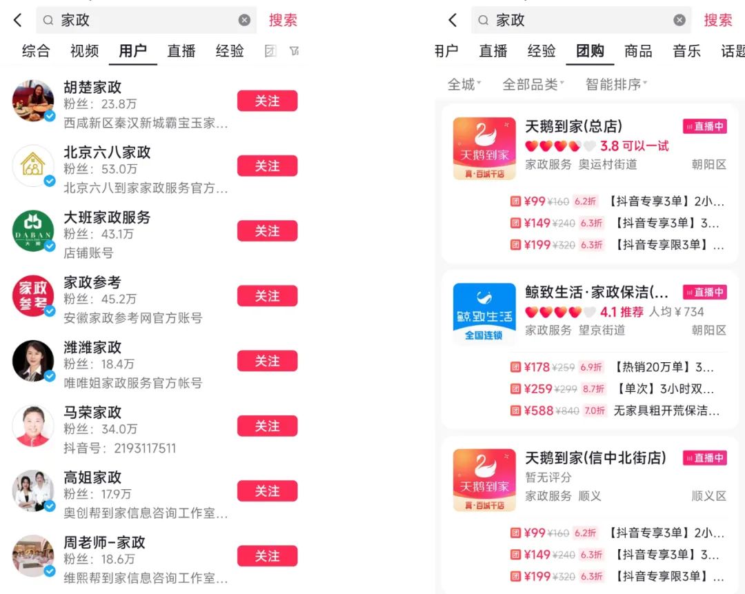 2023年2月,抖音平台正式开通家政行业的团购。服务企业提供营业执照、法人资质等即可入驻,通过设置佣金邀请达人拍视频带货,也可以自己拍视频、做直播等,来销售团购券。