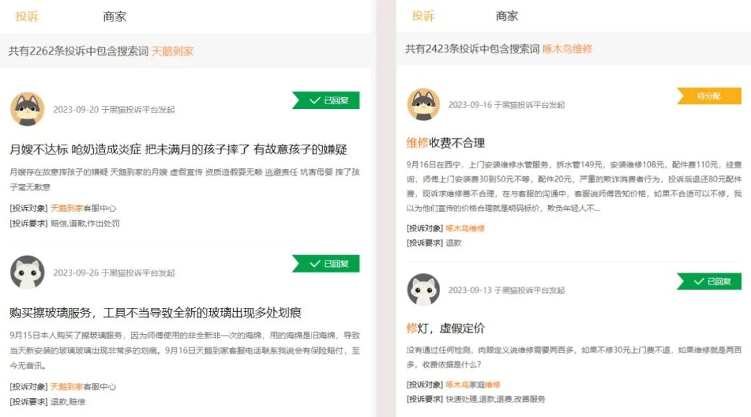 在黑猫投诉平台上,搜索“天鹅到家”关键词,显示投诉达2262条,其中不乏“月嫂不达标”“保洁操作不当损坏家具”“保姆服务未到期剩余费用没退还”等问题;啄木鸟家庭维修相关投诉达2423条,消费者针对“维修费用不合理”“维修后依然存在故障”等情况也多有不满。