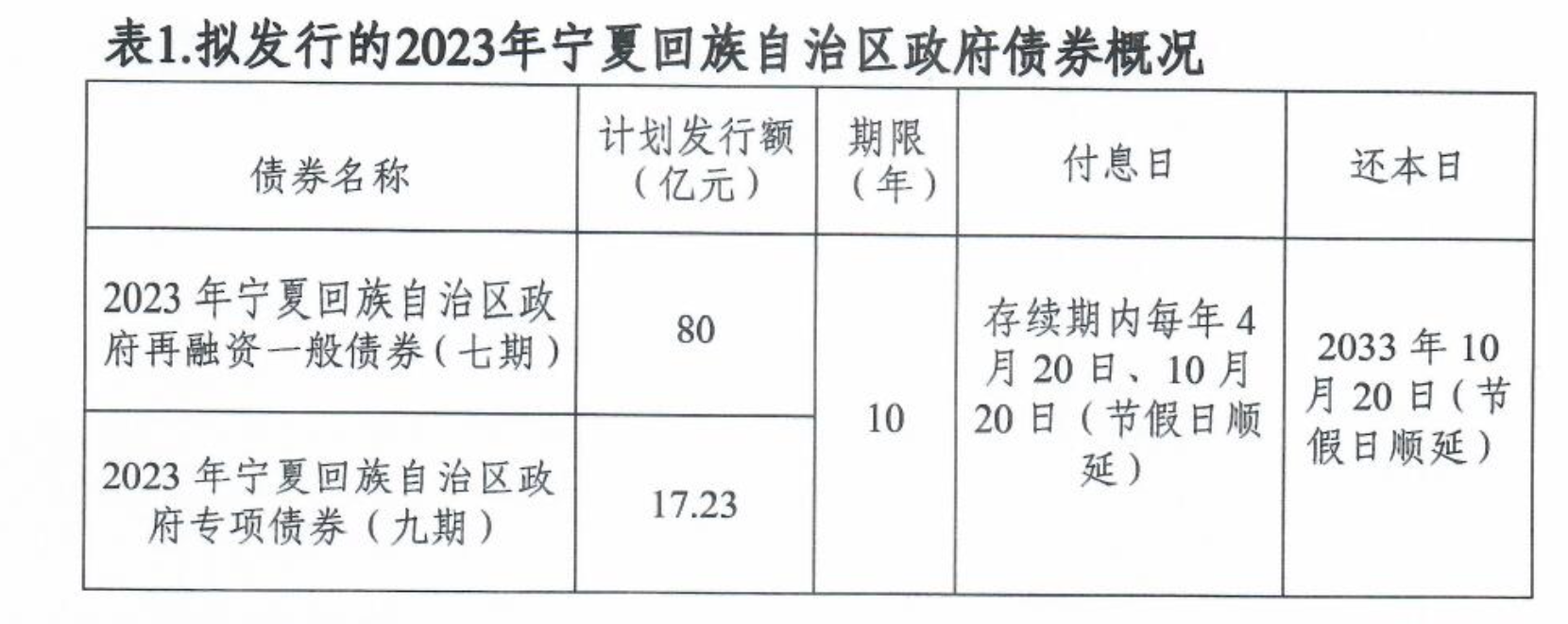 中国债券信息网10月12日披露,宁夏回族自治区财政厅公告,拟发行2023年宁夏回族自治区政府再融资一般债券(七期),计划发行金额80亿元,募集资金投向为发行地方政府再融资债券偿还存量债务,期限10年期,将于2023年10月19日进行招标。