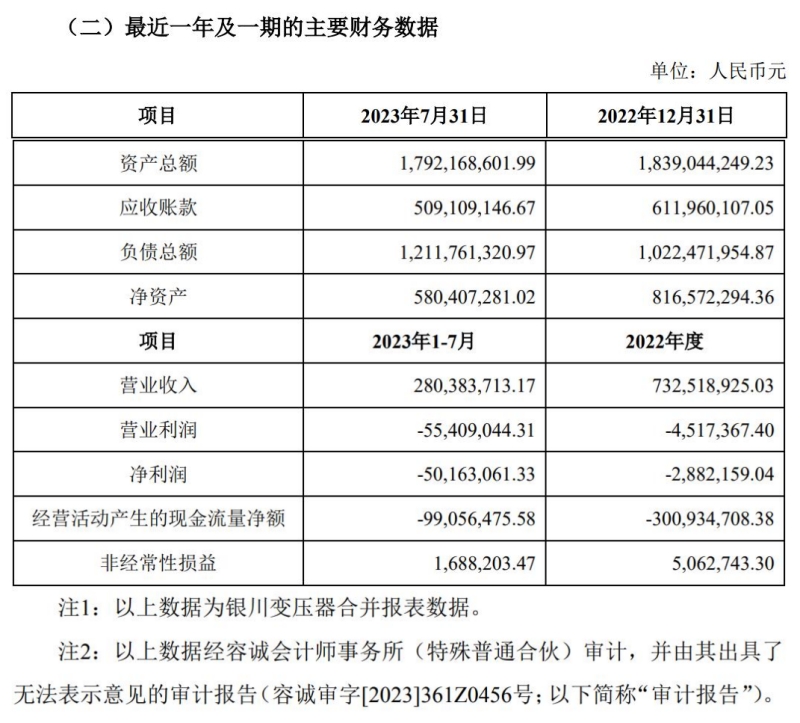 值得一提的是,银川变压器的2022年及2023年1-7月的财务报表被出具了无法表示意见的审计报告。