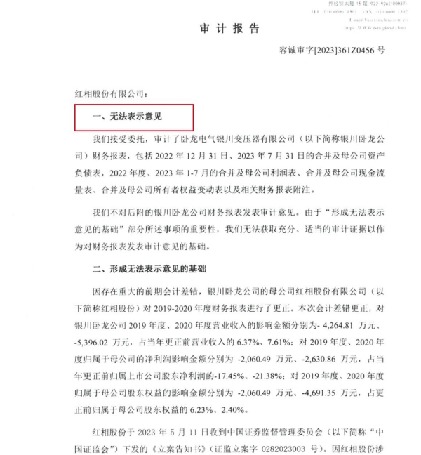 该审计报告形成无法表示意见的基础为:因存在重大的前期会计差错,红相股份(即*ST红相)对2019-2020年度财务报表进行了更正;本次会计差错更正,对银川变压器公司2019年度、2020年度营业收入的影响金额分别为-4264.81万元、-5396.02万元,占当年更正前营业收入的6.37%、7.61%;对2019年度、2020年度归属于母公司的净利润影响金额分别为-2060.49万元、-2630.86万元,占当年更正前归属上市公司股东净利润的-17.45%、-21.38%;对2019年度、2020年度归属于母公司股东权益的影响金额分别为-2060.49万元、-4691.35万元,占更正前归属于母公司股东权益的6.23%、2.40%。