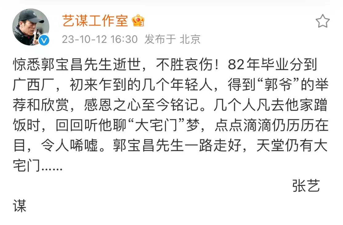 消息传出后,导演张艺谋通过工作室在微博发文悼念:“惊悉郭宝昌先生逝世,不胜哀伤”。他表示,自己82年毕业分到广西厂,作为初来乍到的几个年轻人,曾得到郭宝昌的举荐和欣赏,“感恩之心至今铭记”。