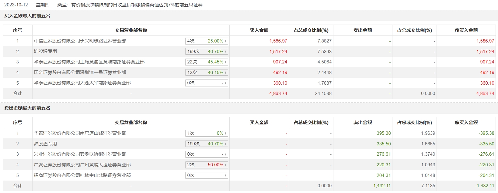 其中,中信证券长兴明珠路证券营业部、沪股通专用分别买入1586.97万元、1517.24万元;华泰证券南京庐山路证券营业部、沪股通专用分别卖出395.38万元、335.5万元。