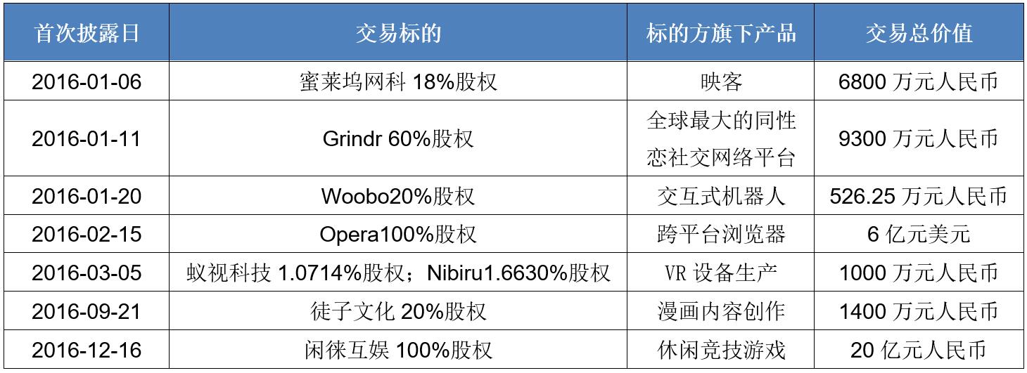 回顾今年以来昆仑万维的投资,收购对象涵盖了同性社交网络Grindr、直播平台映客的母公司蜜莱坞网络科技有限公司、设计生产交互式机器人的Woobo、生产VR穿戴设备的北京蚁视科技有限公司,甚至还有网红使徒子创立的文化公司北京徒子文化有限公司,地域范围上则从东到西,横贯全球。