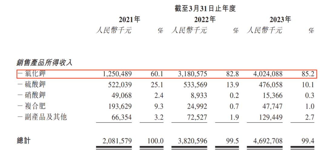 其中,氯化钾是米高集团最主要的产品。招股书显示,2021财年-2023财年,来自氯化钾的收入占比总收入的60.1%、82.8%、85.2%。(编者按:财年是指4月1日至次年3月31日)