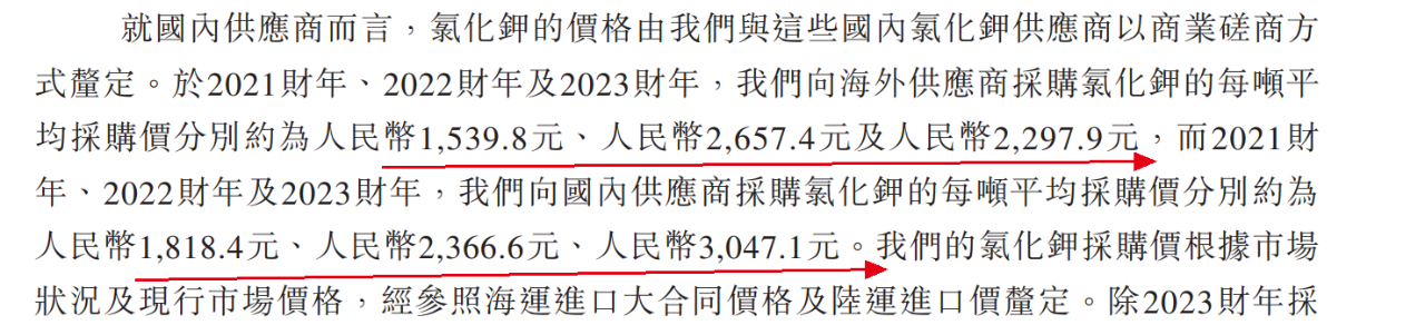 由此计算,于2023财年时,国内供应商氯化钾采购单价比国外供应商采购单价高出30%以上。