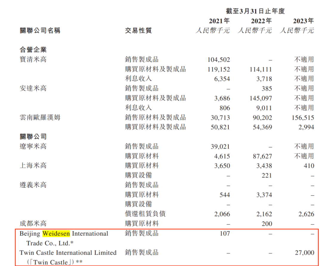 此外,招股书显示,米高集团曾在2021财年向刘国才夫妻控股的Beijing Weidesen销售制成品,金额为10.7万元;2023财年,米高集团向刘国才近亲曾控制的Twin Castle销售制成品2700万元。