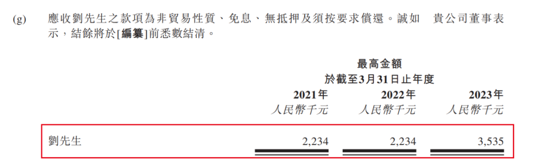 不仅如此,2021财年-2023财年,米高集团应收刘国才的款项分别为223.4万元、223.4万元、353.5万元,此款项为“非贸易性质、无抵押且免息”。这也意味着,于报告期内,刘国才无偿占用了米高集团上百万的现金流。