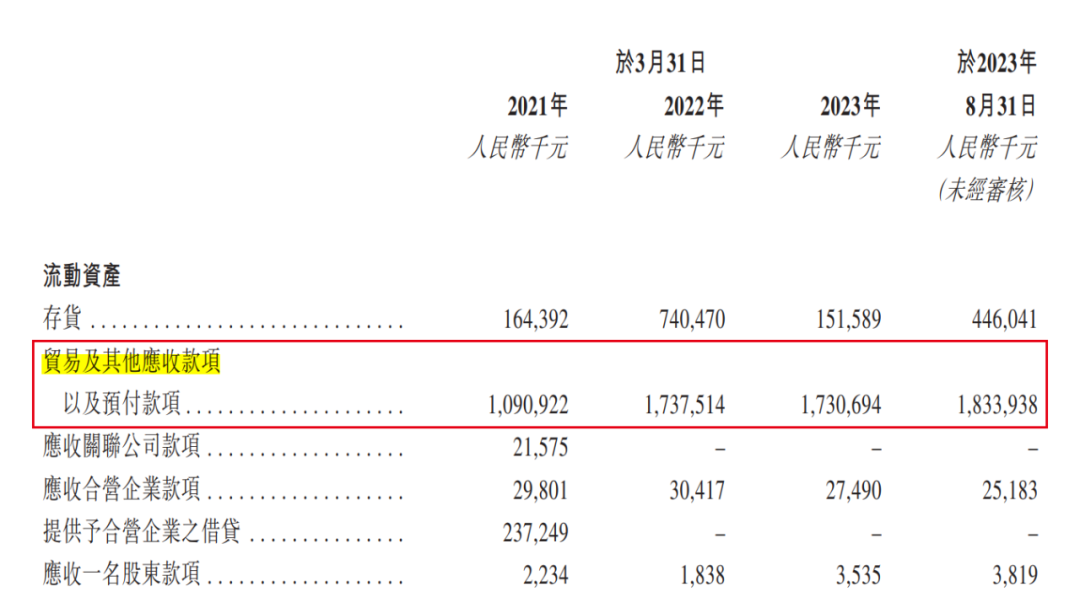 2021财年-2023财年,贸易及其他应收款项以及预付款项分别为10.91亿元、17.38亿元、17.31亿元。于2023年8月31日时,这一数据再次走高至18.34亿元。