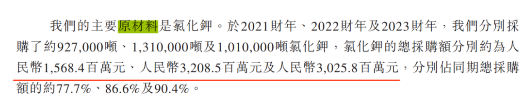 以最主要的原材料氯化钾为例,2021财年-2023财年,氯化钾采购额分别为15.68亿元、32.09亿元、30.26亿元,占比收入的60%以上。