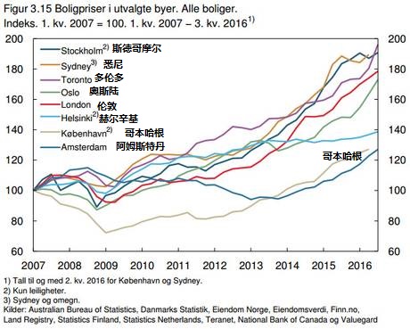 首先要看房价有没有泡沫。最近挪威银行出了一份报告,列出了北欧四国的首都,荷兰的阿姆斯特丹,英国的伦敦,澳洲的悉尼,加拿大的多伦多的房价升幅比较,如下图。