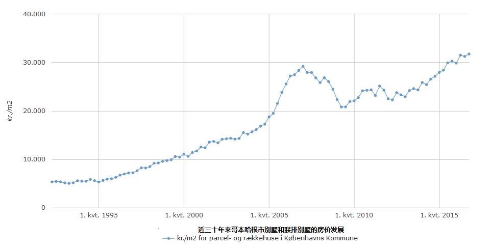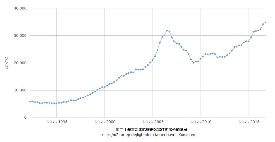 既然房产的持有成本这么高,有没有投资的价值呢?虽然每月房产的持有成本高,但是出租的话租金也相对的很高,不然哥本哈根生活成本指数世界前列是无中生有的么?而且在哥本哈根市区,往往是一房难求,除了要付得起高昂租金,还要靠运气呢。因为在丹麦,法律是保护租客的,所以房东一般不外租,而且对房客很挑剔。一般租金回报毛利率有8-10%左右,而房价的走势如下图,近三十年来稳步上升。除了08年金融危机后回落,但总体的趋势还是向上的,哥本哈根市的房价13年后平均每年上涨10%左右,每年总体回报率18%-20%,是很好的投资标的。