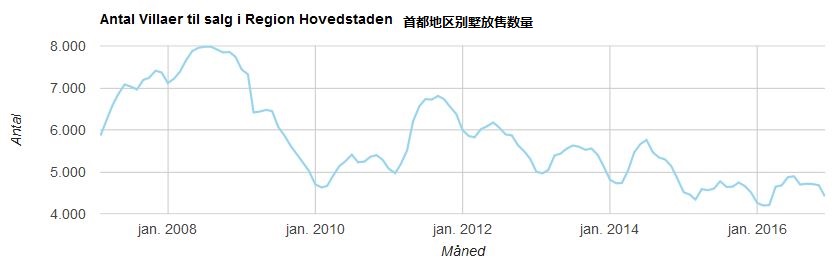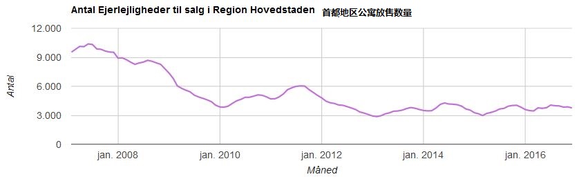 再看看首都大区的供需情况。首都大区包括哥本哈根市等29个小城市,很多人为了住大一点的房子或者买便宜一点的房子就会搬到哥本哈根市附近的其他城市居住。但是房价会有波浪效应,会涨幅会溢出到附近周边的城市。如果首都的大区的供求也紧张的话,那哥本哈根市的房价只会因为供需不平衡越涨越高。如下图所示,金融危机以后,市场的供量一直下降。其中的主要原因是,新建的房屋数量少,只有当房地产市场复苏到一个利润诱人的状态,地产商才会增加建案。所以目前来看,哥本哈根市区,甚至哥本哈根首都大区的房地产市场还是健康和趋势向上的,甚至未来二三年会有一个上涨的小高峰。