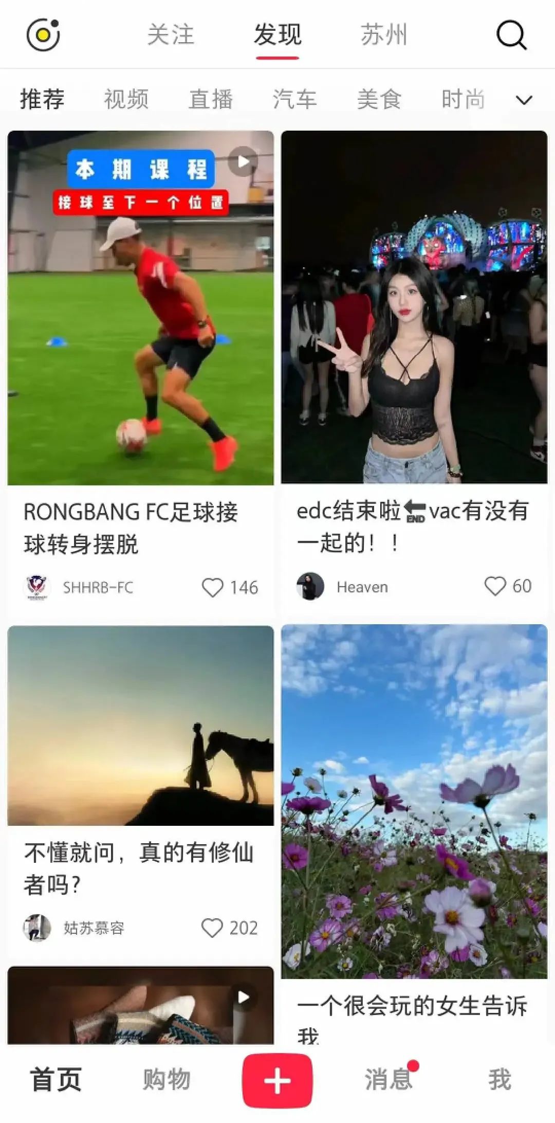 比如落在我手里,这本小红书已经和“集美”们手里的那本完全不同。我的小红书首页里既有漂亮的姐妹,也会有足球新闻,还会有汽车内容,甚至有如何磨刀、如何开大铁锅的教学视频。