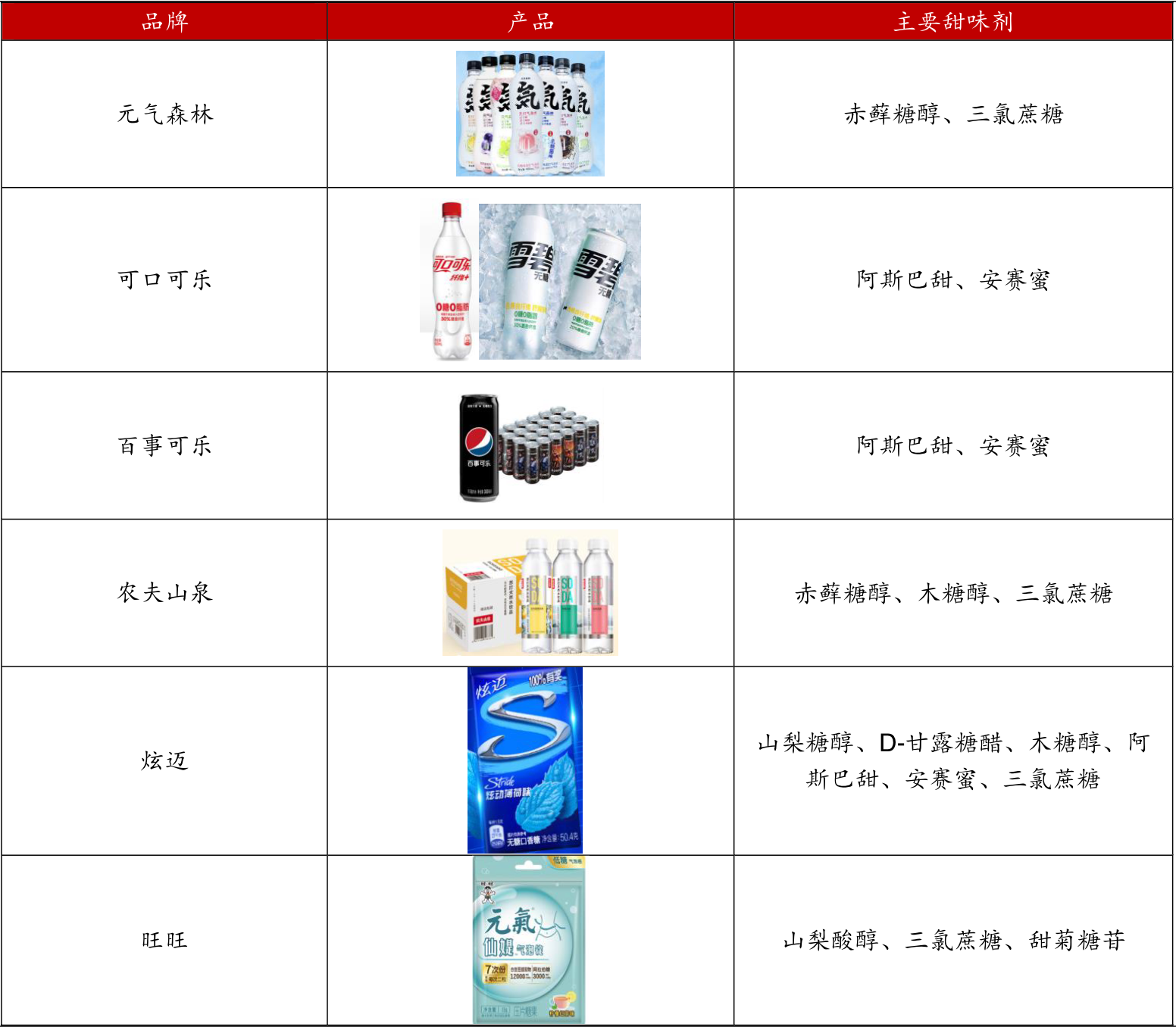 “甜价比”代表单位蔗糖价格下,能够实现的相对于蔗糖的甜度倍数。2021年蔗糖、安赛蜜和三氯蔗糖的甜价比分别为0.19、2.89、2.39(甜度/元)。相当于一瓶饮料中如果蔗糖的成本为0.2元,换成三氯蔗糖只需要0.016元,换成安赛蜜只需要0.013元。