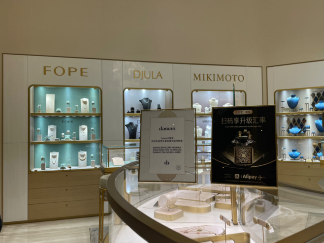 劲旅君随机选择多家商铺,抽样调查显示,迪拜Mall可以使用的国内支付软件主要是支付宝,同时也接入了从支付宝升级而来的Alipay+。目前,迪拜mall里超过一半以上的商家,都已经接入了这样的移动支付方式,以奢侈品、化妆品、黄金珠宝、服装鞋包等高档店铺为主。