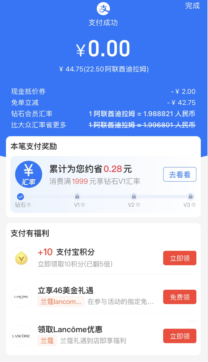 劲旅君及朋友亲测了三单交易,账单显示:上支付宝“惠出境”,用优惠券一单减免8元(优惠券)、一单减免2元(优惠券)。后面这单同时还抽中了“免单”机会,当场全额免掉44.75元人民币(相当于22.50迪拉姆)。这种减免力度,很难不吸引中国游客参与。