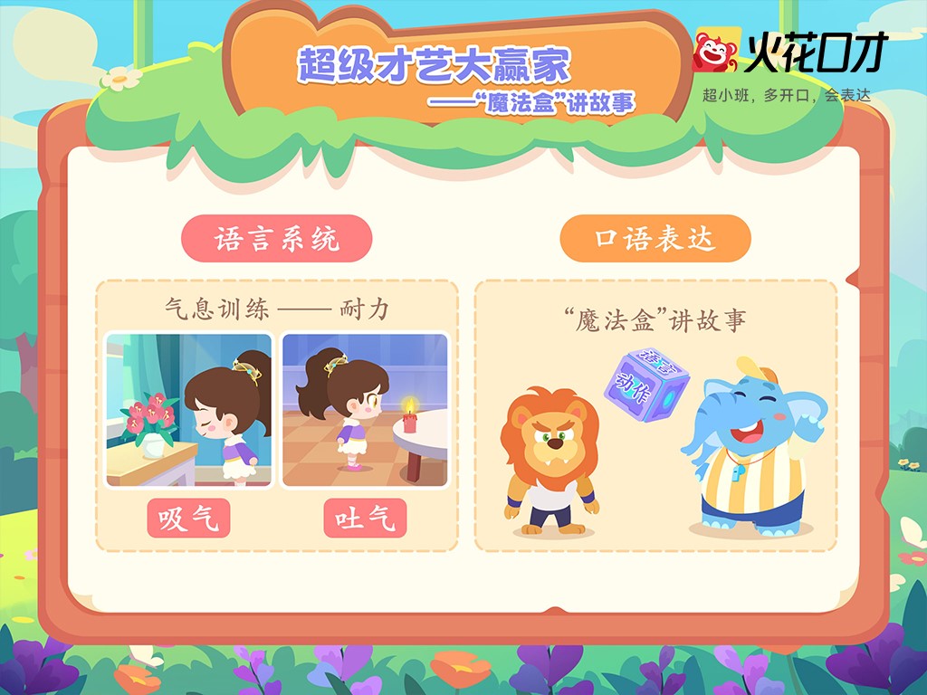如今,经过火花口才教研团队深度调研研发,火花口才课程将孩子们展现出的口才痛点逐一击破。首先,掌握口才能力,多说多练是关键。因此,火花口才课以超小班( 1v4 )系统语言训练课堂为载体,保证每个孩子的训练时长,并且采用“传统口才+新型口才”相结合的生活实用口才,从语言基础和口语表达两个方面,综合培养孩子们的表达能力。其次,为从根本上解决孩子“发音不清晰,不准确”的问题,火花口才独创的“口部操”融合了多维度的训练形式,创新推出以韵律式结合儿歌、拟声词、动物叫声等形式的口部锻炼形式,融合TPR教学法,让孩子全身动起来,将抽象的语言基础训练知识简单化,达到更好的锻炼效果。为了解决孩子语言表达难点,火花口才八大表达模型,包括波折图、魔法盒子等,会将概念具象化,孩子不仅看得懂,也知道如何应用于表达之中。