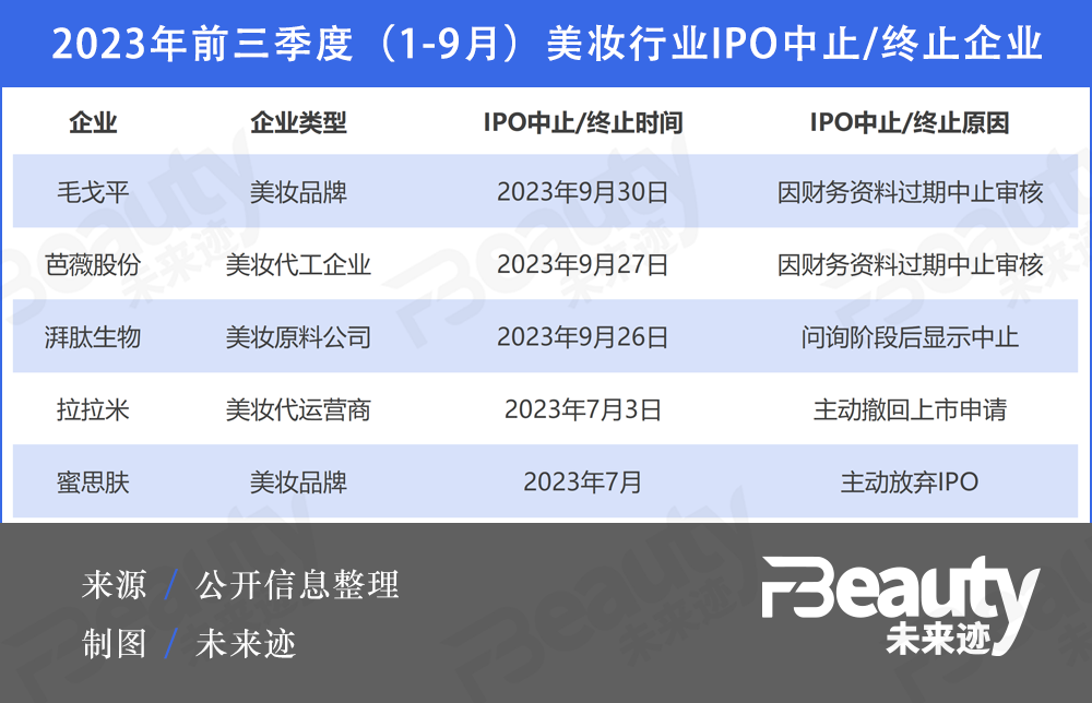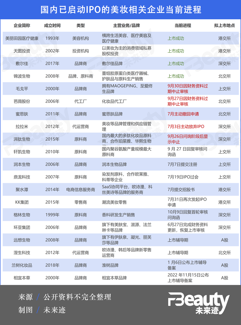 《FBeaty 未来迹》不完全整理发现,截至今年10月,已经有5家美妆相关企业IPO进程呈现中止/终止状态,而放眼整个美妆行业,共有接近20家美妆企业走在上市路上。