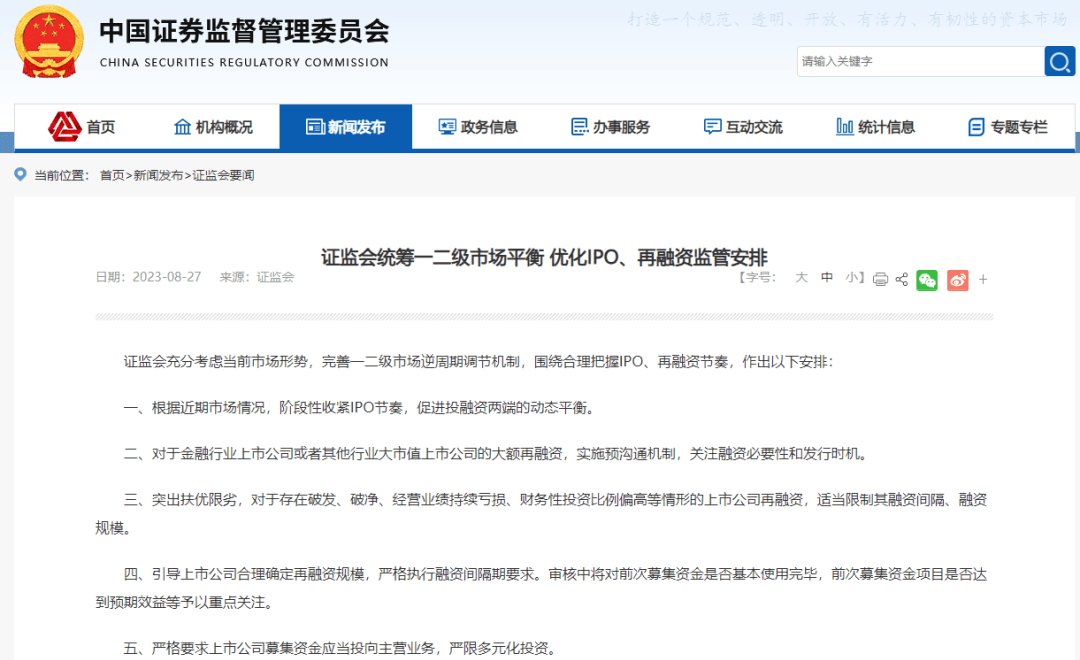 此外,相关政策也在收紧。今年(2023年)8月27日,中国证券监督管理委员会宣布,充分考虑当前市场形势,完善一二级市场逆周期调节机制,围绕合理把握IPO、再融资节奏,进一步规范股份减持行文等做出一系列安排。
