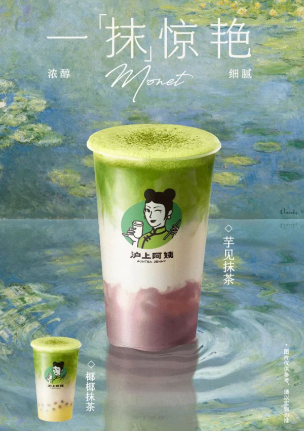 10月11日,沪上阿姨×莫奈睡莲推出抹茶系列新品,包含芋见抹茶和椰椰抹茶两款新品。新品选用国标一级抹茶,经历遮阴、蒸青、干燥、茎叶分离等一系列工序研磨。芋见抹茶新品将抹茶散于茉莉绿茶,搭配荔浦芋泥,椰椰抹茶新品抹茶绿与椰乳白交融,交织绵糯米麻薯。(品牌官方)