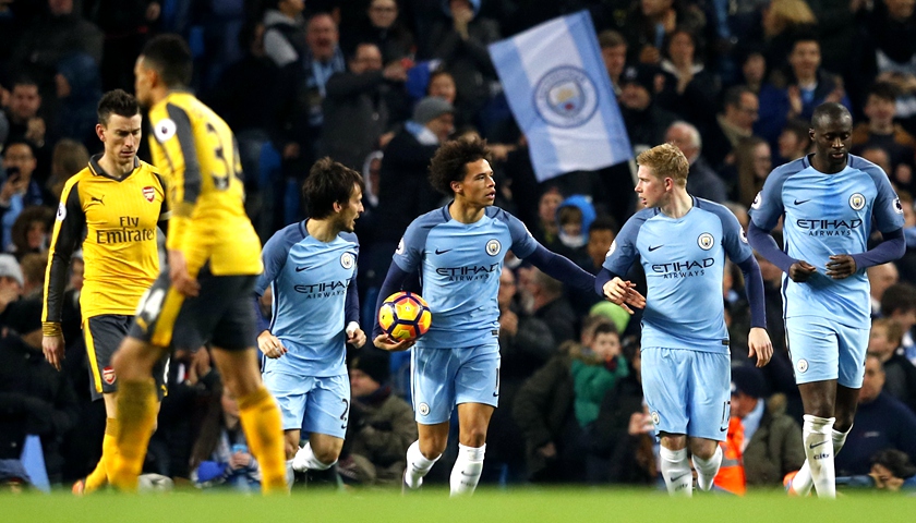 本轮英超的焦点大战在伊蒂哈德球场打响,对阵双方是两支本赛季参加欧冠的球队曼城和阿森纳。阿森纳在近6场迎战曼城取得3胜3平保持不败,而双方的38场英超历史交锋中,阿森纳也是23胜9平6负占据绝对优势。由于阿圭罗的红牌停赛,曼城排出无锋阵型,瓜迪奥拉仅用萨内替换诺利托首发;格也仅用伊沃比替换张伯伦出场。