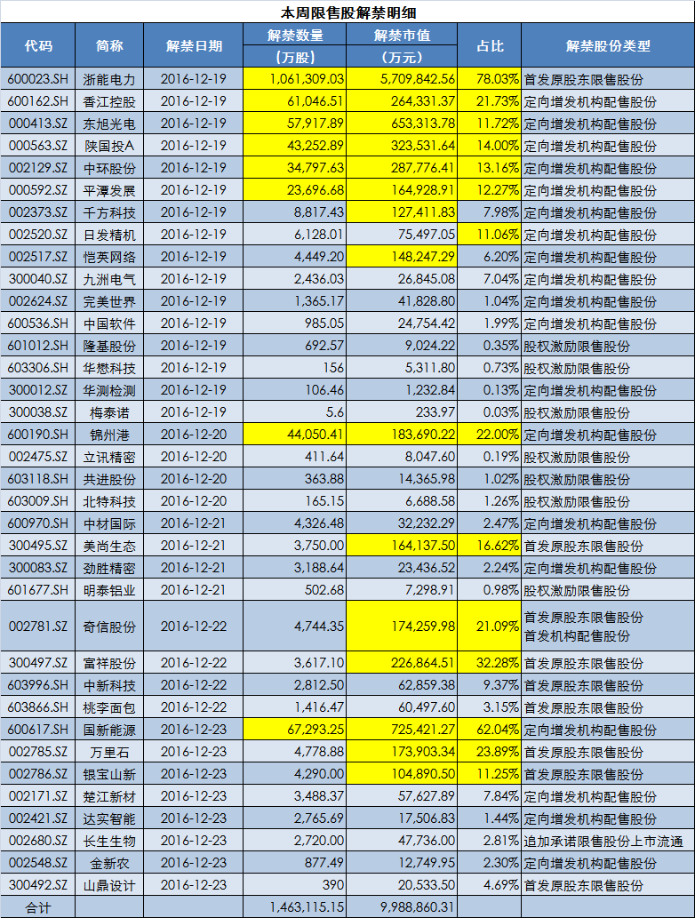 Wind资讯数据显示,12月19日至12月23日预计有36家公司限售股陆续解禁,合计解禁146.31亿股。按12月16日收盘价计算,解禁市值998.89亿元,环比上周增长近七成。