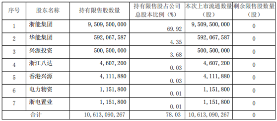 浙能电力本次属首发限售股解禁,解禁的股东有7家,分别是浙能集团、华能集团、兴源投资、浙江八达、香港兴源、电力物资、浙电置业。
