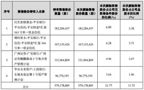 浙能电力是本周也是本月解禁大户。据解禁公告显示,公司在12月19日预计有106.13亿股限售股上市流通,占公司总股本的78%,也占本周解禁总量的超七成;以最新收盘价计算,解禁市值高达571亿元,占本周总量的57%。本次股份上市后,浙能电力将实现全流通。