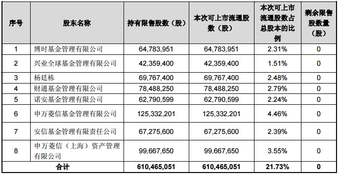 香江控股在12月19日有6.10亿股限售股上市流通,这部分股份是一年前定向增发发行的股份。解禁股东包括博时基金、兴业全球基金、杨廷栋、财通基金、诺安基金、申万菱信基金、安信基金、申万菱信(上海)资管公司共8名。