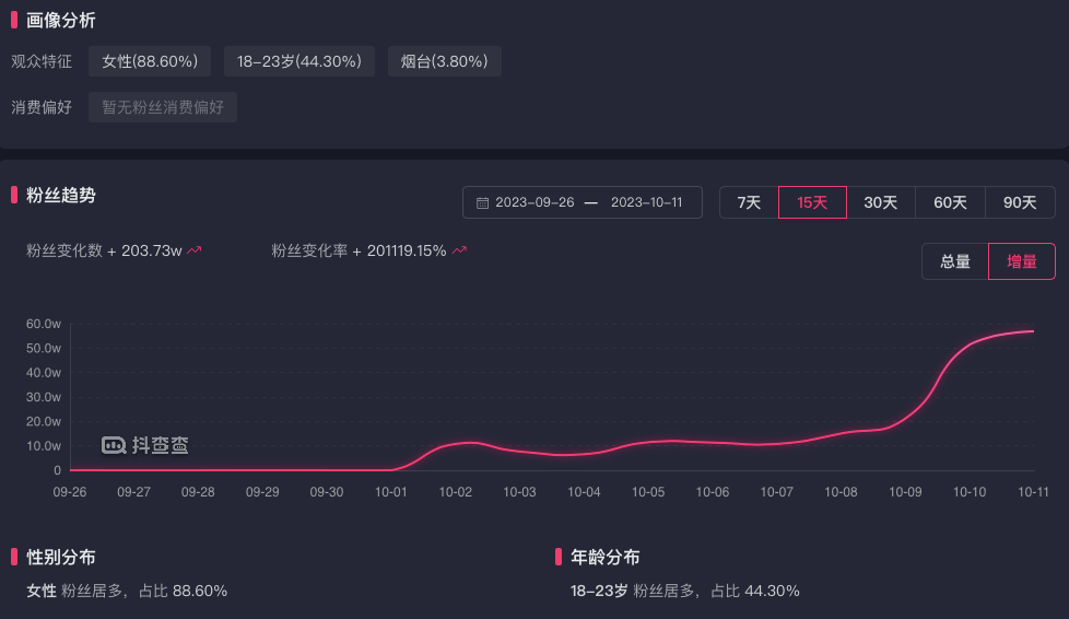 抖查查数据显示,10月1日,于文亮的粉丝才仅有1355个。至10月11日,粉丝数已达到218.4万。10天涨粉200万,一夜爆红,按MCN的思维就是挖到隐藏款,可以马上接广子了。