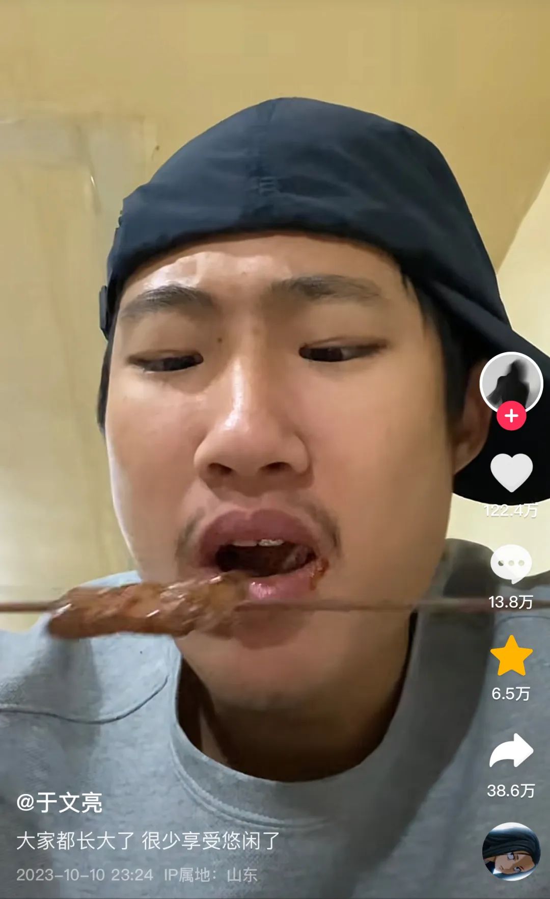 还有一个吃烧烤视频,核心台词来自动画《小马宝莉》。“如果你只爱自己,那就没什么可以伤害你。”于文亮把脸靠镜头非常近,好像在贴着你耳朵说。他找的理由是“我很爱自己,所以我要吃烧烤去了。”后面狼吞虎咽的画面,则配上了该动画的其他金句——“我们不可能戴上面具,假装我们不会爱。”