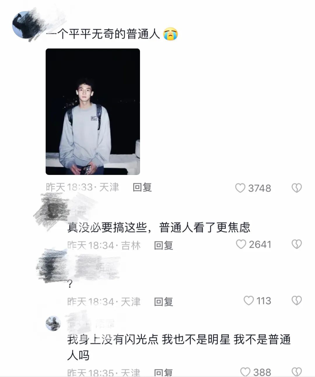 在于文亮的评论区,不少人趁机发出自己的照片。有些看得出是真自卑,害怕他人的负面评价,照片也与其表现的谨小慎微吻合。另有一些,发的明明是精修美照,却硬要说是“平平无奇的普通人”,就很让人摸不着头脑了。阁下如此自卑是天天和娱乐圈神颜比美吗?还有一些几十万粉的博主也带着话题#你没有那么多观众#,放屁,这么些粉丝不是你观众?!