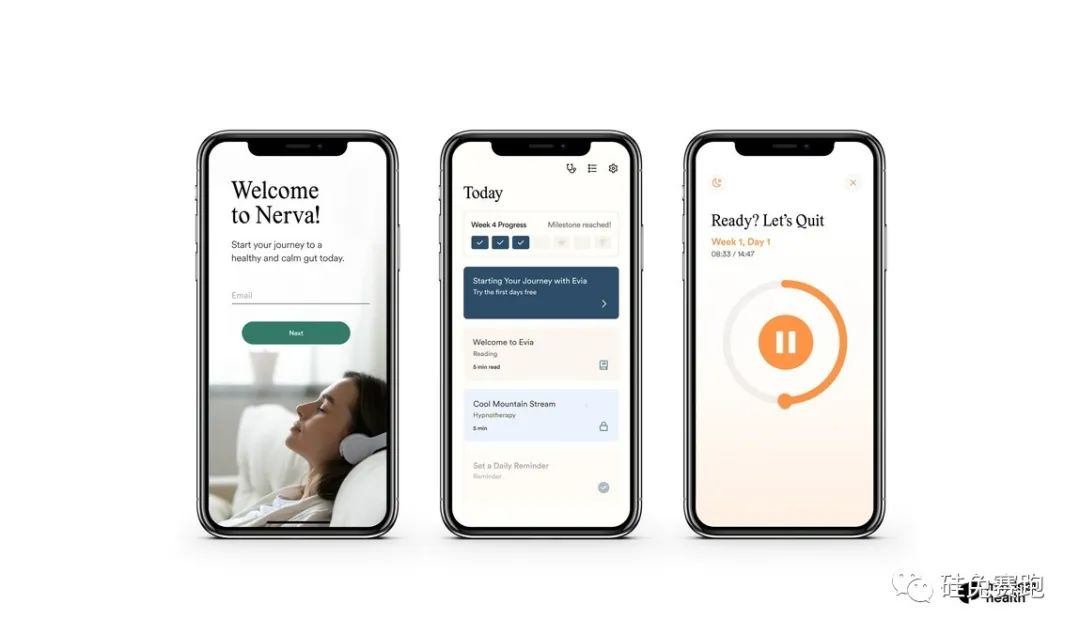 起初Mindset只是专注于整体心理健康,如今则拓展到了更多的健康领域,旗下拥有面向肠易激综合征 (IBS)的Nerva、面向更年期的Evia和用于戒烟的Finito,他们的原理都是通过催眠来激活大脑中的特定区域,帮助更好的接收新概念,促进脑与身的联结,比如戒烟项目激活的是注意力/幸福感/动力的相关区域,Nerva则是通过意念修复肠道内过于敏感的神经。