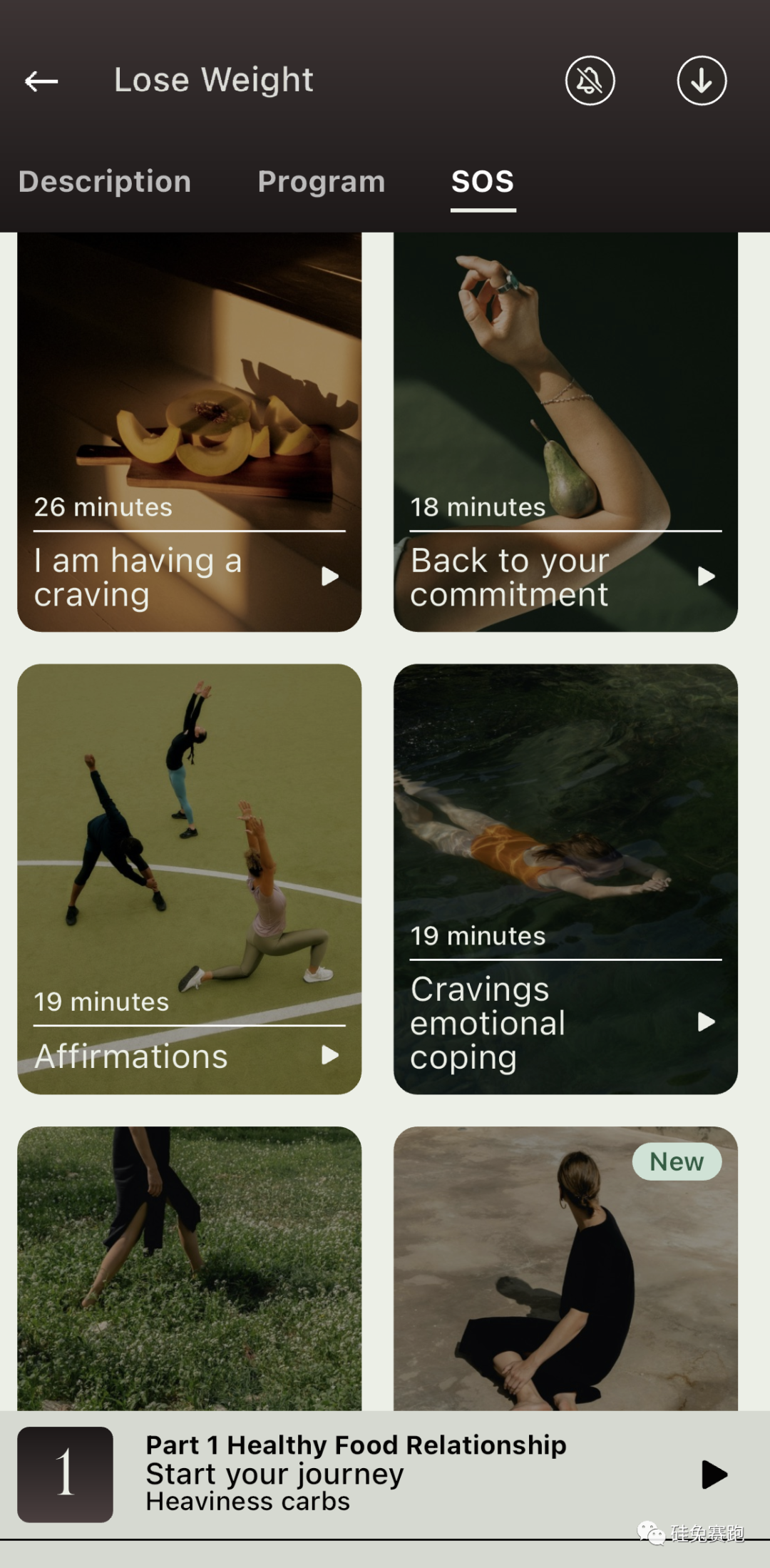 Oneleaf的课程每次只需20分钟,通过语音引导用户用自我意识进行“灵魂拷问”,比如想要减肥的用户会在放松的状态下思考“我为什么会情绪性进食”,“如何无愧疚心的进食”,“健身对于我生活的积极意义”等问题。