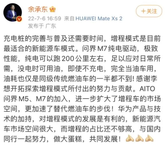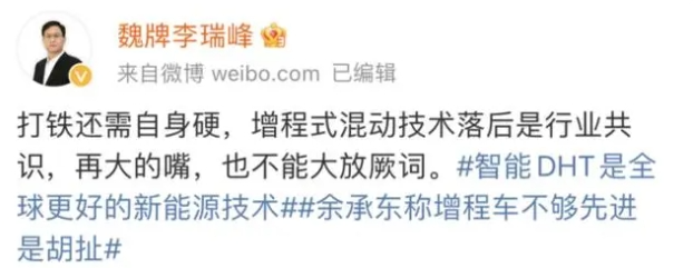相较于魏牌李瑞峰对增程式路线的评价——“技术落后,已经是行业共识”,鼓吹增程式,是“大放厥词”,余承东则否认了增程式是落后路线的说法,他认为增程式电动汽车“把增程发动机拿掉,其实就是纯电动车”。李想更是认为,说增程电动是个落后技术,是“一群毫无用户思维,完全不关心用户的”的技术人员的“胡说八道”。