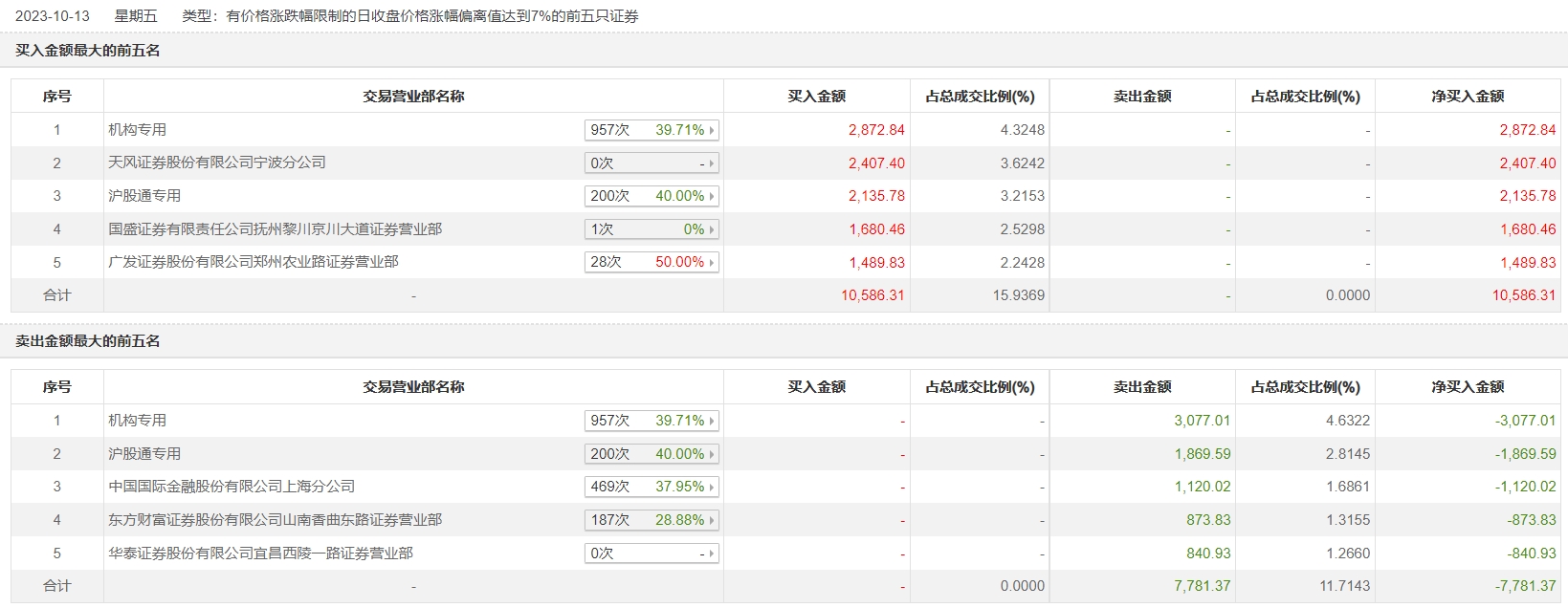 其中,机构买入2872.84万元,卖出3077.01万元,合计净卖出204.17万元。此外,天风证券宁波分公司、沪股通专用分别买入2407.40万元、2135.78万元;沪股通专用、中国国际金融上海分公司分别卖出1869.59万元、1120.02万元。