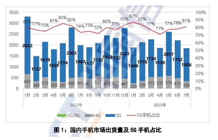而中国信通院发布了2023年7月国内手机市场运行分析报告,报告显示,2023年1-7月,国内市场手机总体出货量累计1.48亿部,同比下降5.1%。