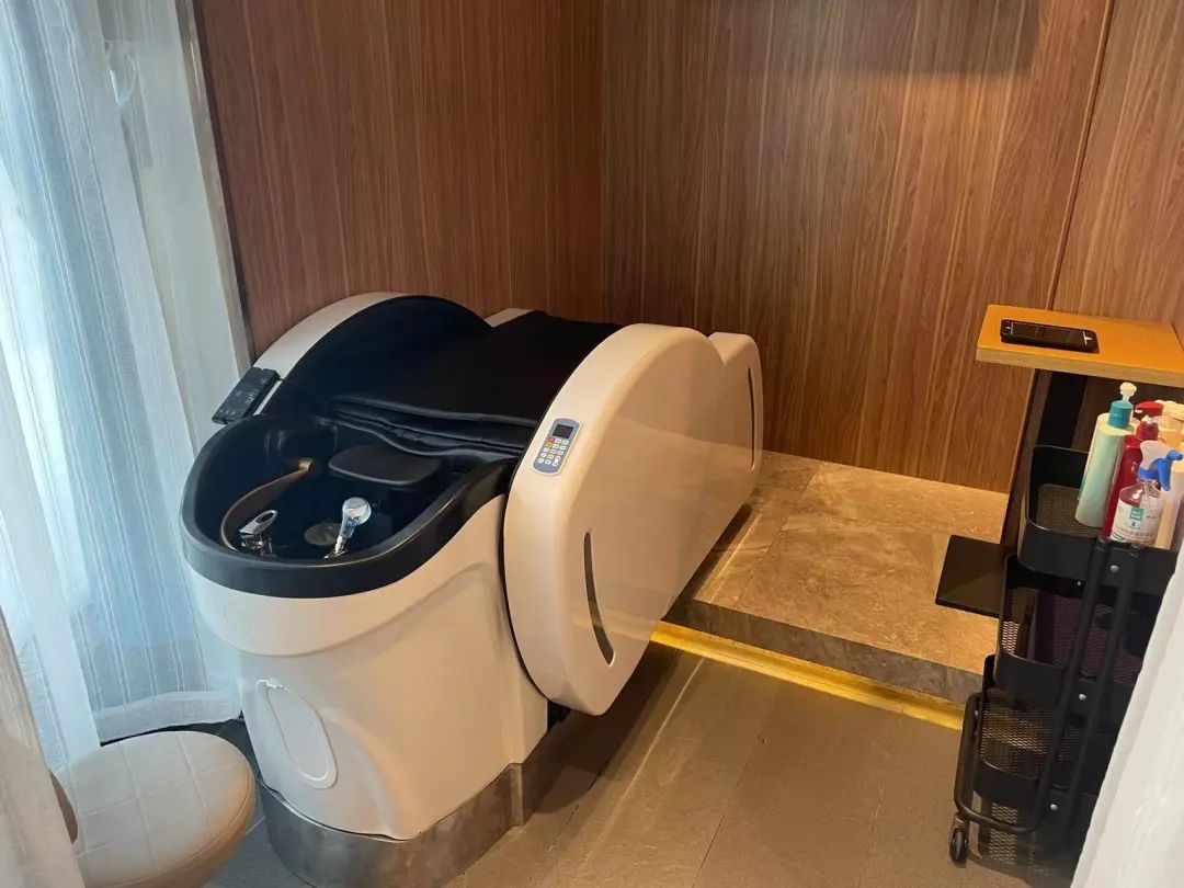 事实上,不止气味,整个洗头发的流程都无限接近美发店。在正门的旁边,这家海底捞开辟了一个纱帘挡住的小房间,刚好容下一张按摩洗发椅,可以一边按摩一边洗头。