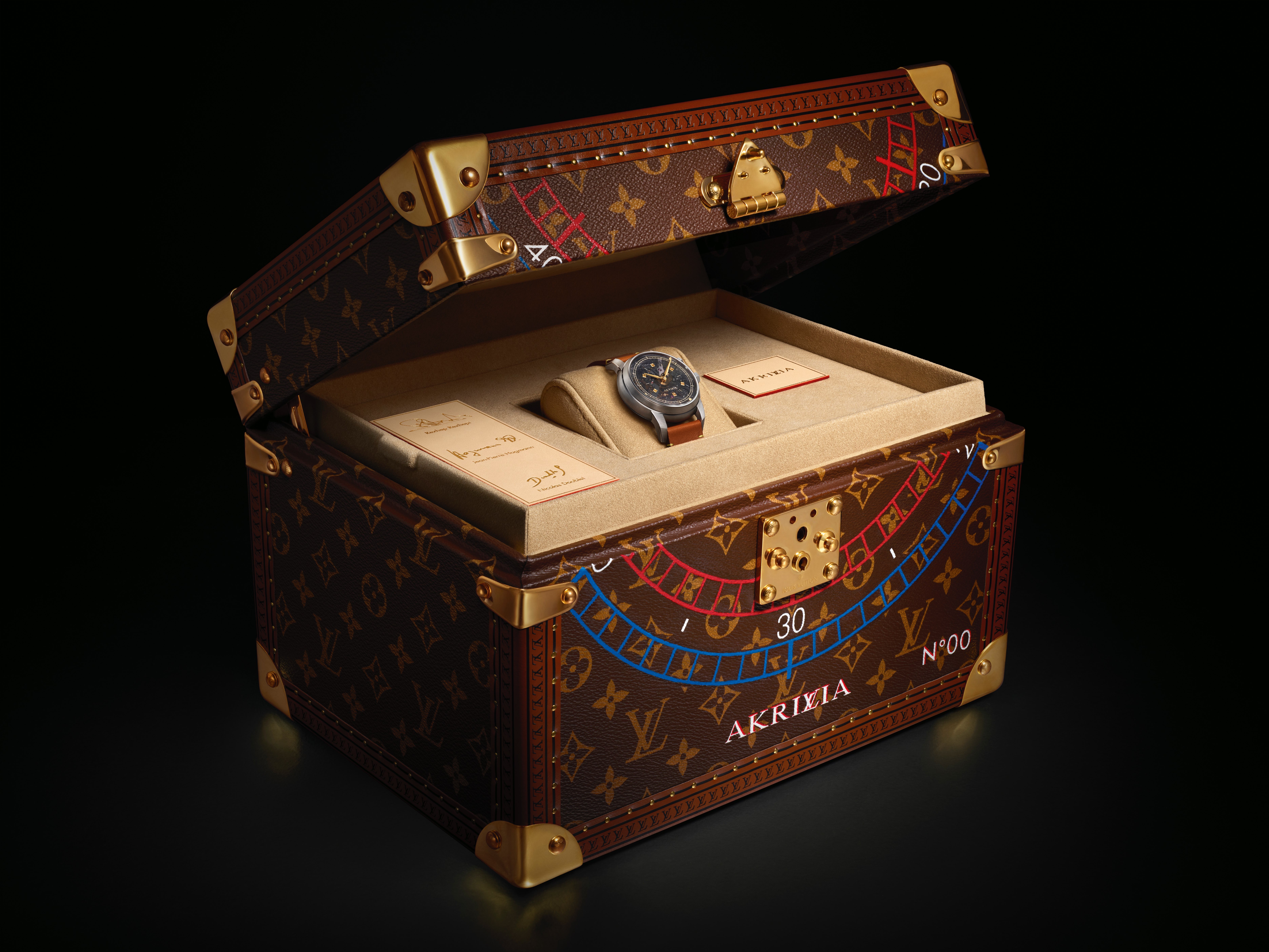 LVRR-01 腕表采用特别绘制的路易威登经典表箱包装。每只 LVRR-01 腕表的表箱均由手工绘制,图案元素包含珐琅表盘上的计时码表刻度、AKRILVIA标识以及腕表序列号。