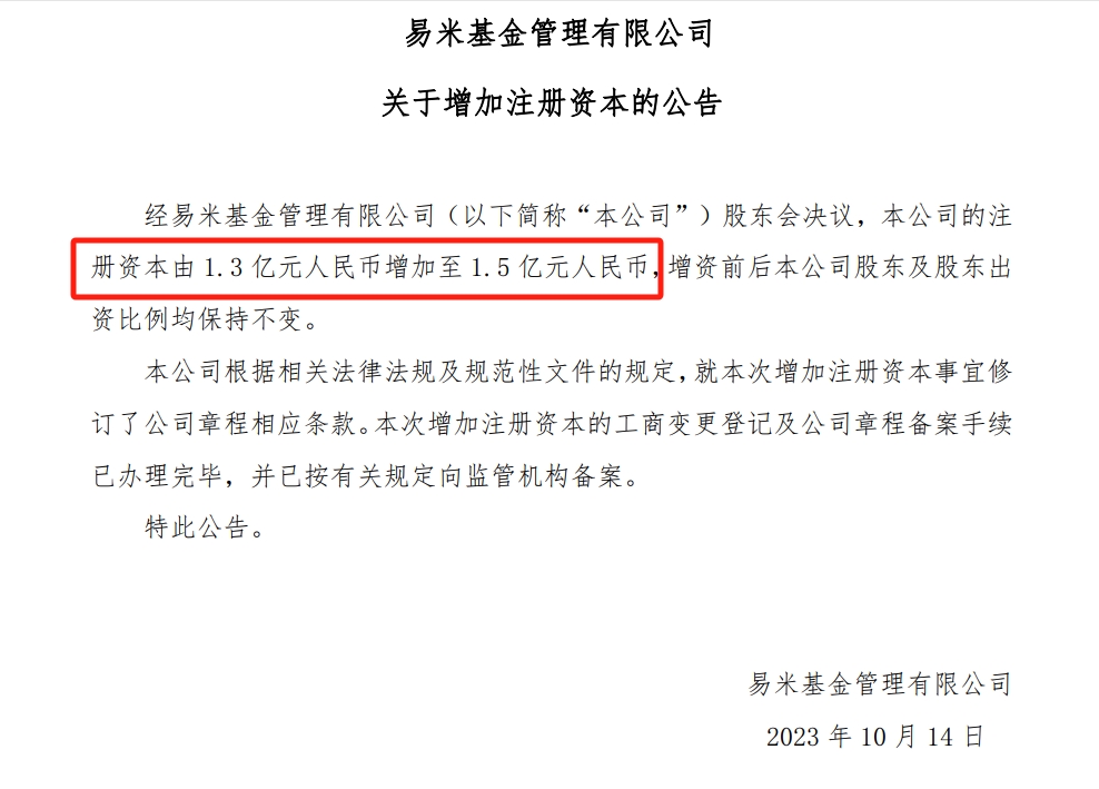 10月14日,易米基金公告称将注册资本从1.3亿元增加至1.5亿元,增资前后公司股东及股东出资比例均保持不变。