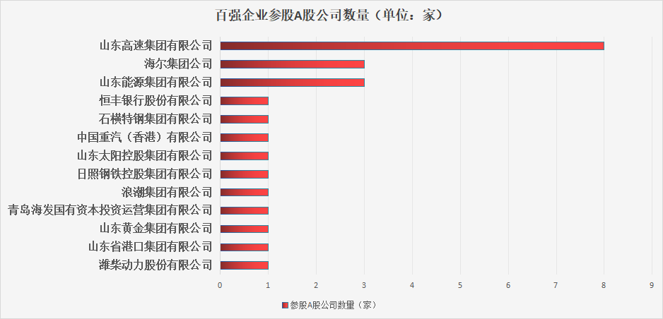 而在参股方面,山东高速集团有限公司参股A股公司数量最多,达到8家,涉及中泰证券(600918.SH)、渤海轮渡(603167.SH)、福龙马(603686.SH)等。山东能源集团有限公司、海尔集团公司分列其后,均参股3家A股公司。还有10家企业各参股了1家A股公司。