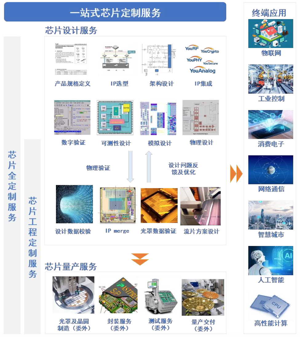 根据说明书,灿芯股份专注于提供一站式芯片定制服务的集成电路设计服务企业,基于自身全面的芯片设计能力、深厚的半导体IP储备与丰富的项目服务经验,为客户提供一站式芯片定制服务,包括芯片定义、IP选型及授权、架构设计、逻辑设计、物理设计、设计数据校验、流片方案设计等全流程芯片设计服务。该公司在为客户提供芯片设计服务后,根据客户需求可继续为其提供芯片量产服务。