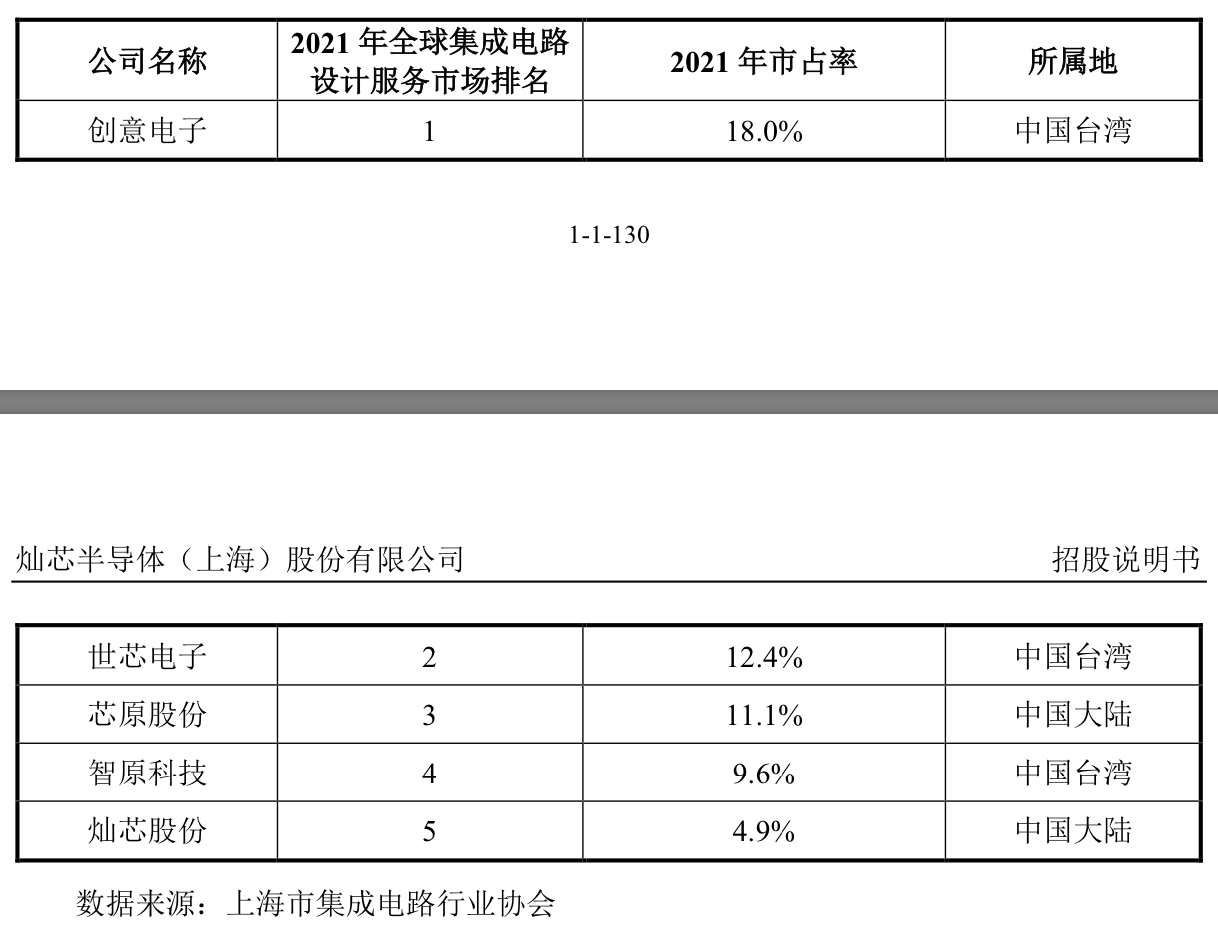 根据说明书介绍,行业内主要企业有创意电子(3443.TW)、智原科技(3035.TW)、世芯电子(3661.TW)、芯原股份(688521.SH)、锐成芯微。根据上海市集成电路行业协会报告显示,2021年度灿芯股份占全球集成电路设计服务市场份额的4.9%,位居全球第五位。