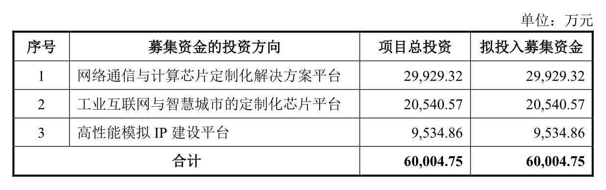 这一次募资6亿元,有近3亿元投入到“网络通信与计算芯片定制化解决方案平台”,2亿元出头投入“工业互联网与智慧城市的定制化芯片平台”,其余投入到“高性能模拟IP建设平台”。