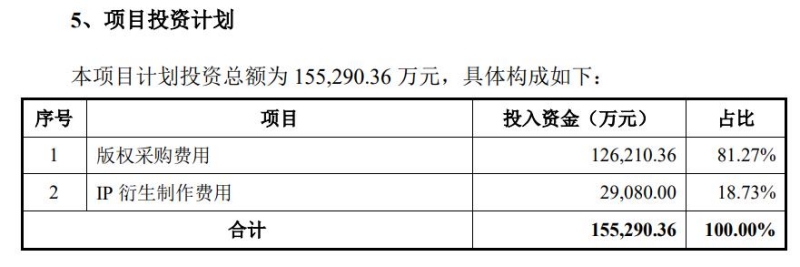 在“IP内容资源升级建设项目”的投资计划中,版权采购费用拟投入12.62亿元,占该项目投资总额的81.27%,其余18.73%资金将作为IP衍生制作费用。该项目计划建设周期为3年,但中文在线表示会根据实际需求情况动态调整项目实施进度。至于该项目的经济效益,中文在线在增发预案中并未具体论证,而只披露为:“经测算,本项目具有较好的经济效益。”