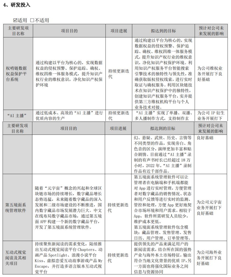 根据中文在线2022年年报,当时主要研发项目有“权哨链数据权益保护平台系统”、“AI主播”、“第五境面系统管理软件”和“互动式视觉阅读及其相关项目”等四个项目。