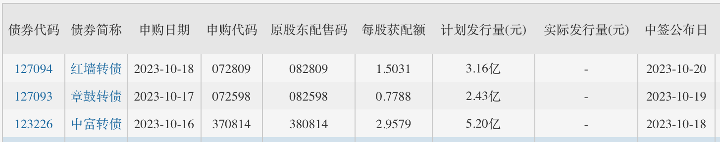 另外,本周有3家已上市公司的可转债能够申购,分别是中富转债(123226)、章鼓转债(127093)、红墙转债(127094),三者的申购日期分别为10月16日、17日、18日。据悉,三者的计划发行量分别为5.2亿元、2.43亿元、3.16亿元。