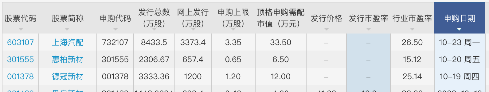 需要指出的是,上海汽配(603107.SH)的申购日期也已确定,为10月23日,即下周一。该股的申购上限3.35万股,顶格申购需配市值33.5万元。上海汽配的主营为汽车空调管路和燃油分配管等汽车零部件产品的研发、生产与销售。