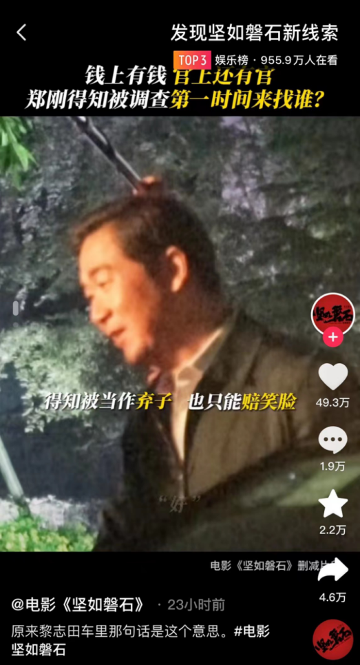 事实上,这种“拼图式营销”也成效显著。在抖音热榜中,#发现坚如磐石新线索##李乃文说刘锋得留一手##坚如磐石谁杀了朱丽#等有关话题都获得高位热搜。这几日,《坚如磐石》仍然延续国庆档票房第一的势头,连续成为日票房冠军,有望突破15亿。可以看出,片方放出删减片段有效地维持了受众对《坚如磐石》的讨论度,从而引发二次传播,达到长尾票房的效果。